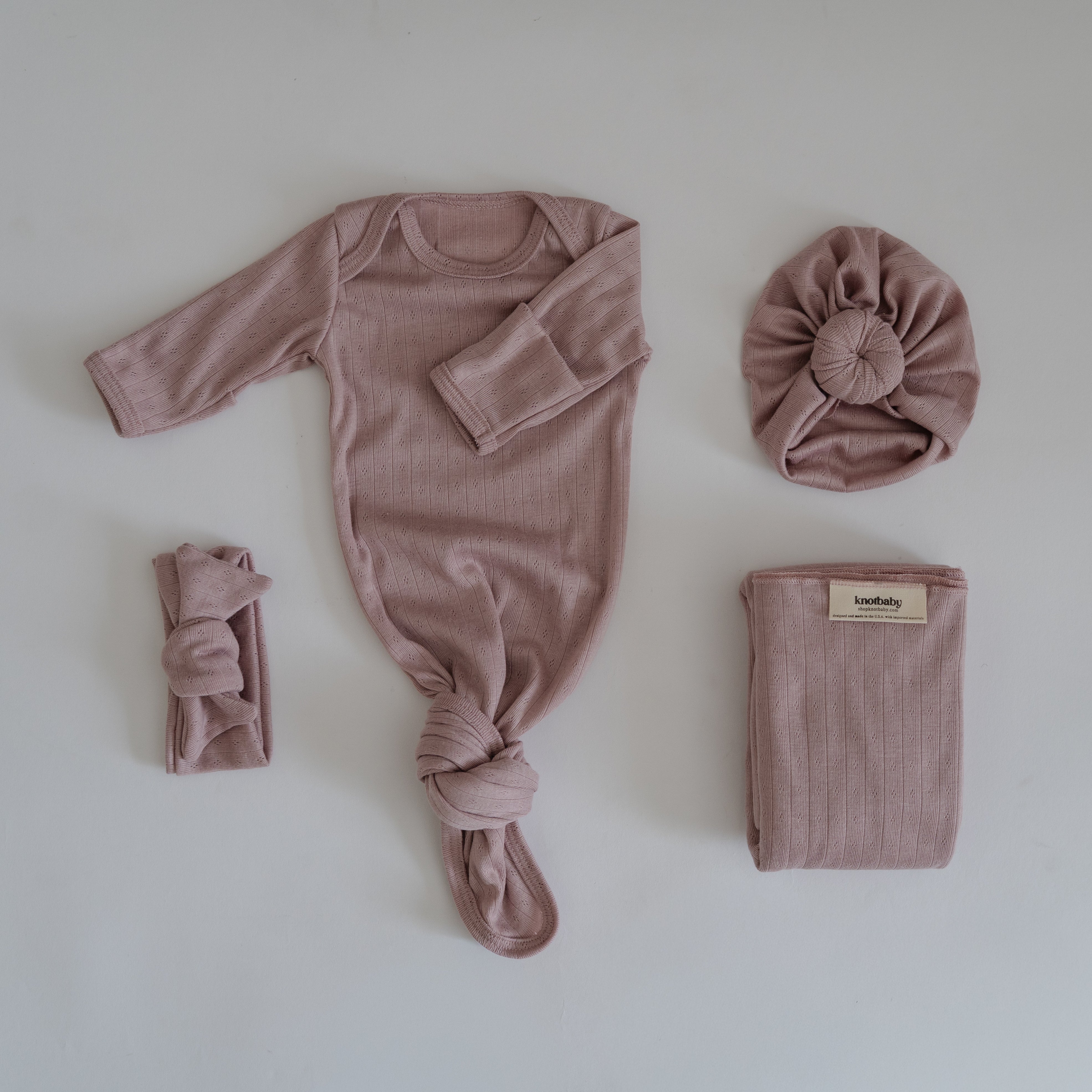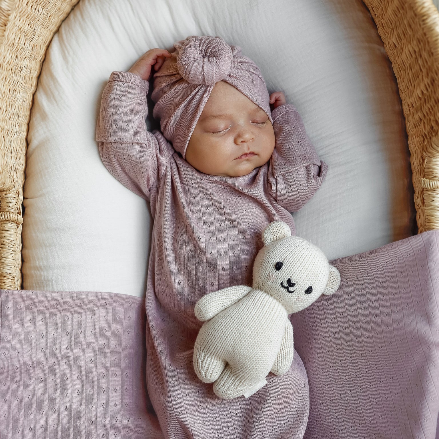 The Mulberry Pointelle newborn bundle offers a gentle and cozy first outfit for your baby. It includes a soft pointelle sleeper nightgown and a matching headwrap made from breathable fabric. Thoughtfully designed for easy nighttime changes, this set keeps your little one comfortable and snug from bedtime through playtime, providing warmth and subtle style all day long.